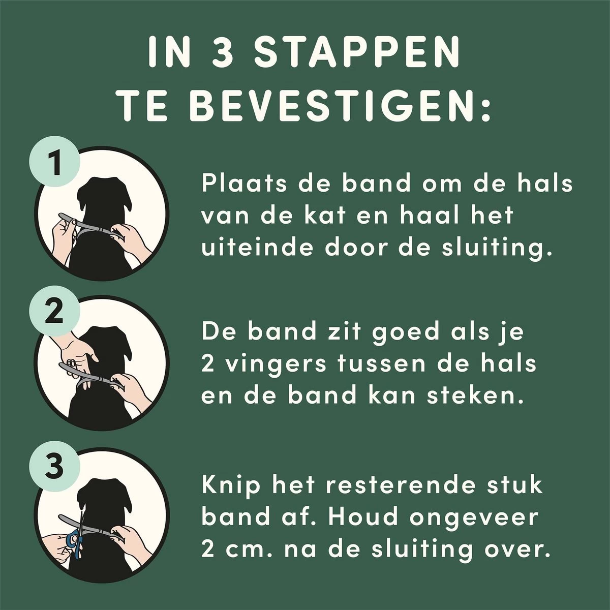 Verwijder alle verpakkingsmaterialen. Activeer de vlooien-/tekenband door deze enkele malen flink uit te trekken. Hierdoor openen de poriën en komen de werkzame stoffen vrij. Plaats de band losjes rond de nek van het dier, zodanig dat twee vingers makkelijk tussen de hals en halsband passen. Snijd het overtollige band af. De band wordt volledig actief na 72 uur en is waterbestendig.