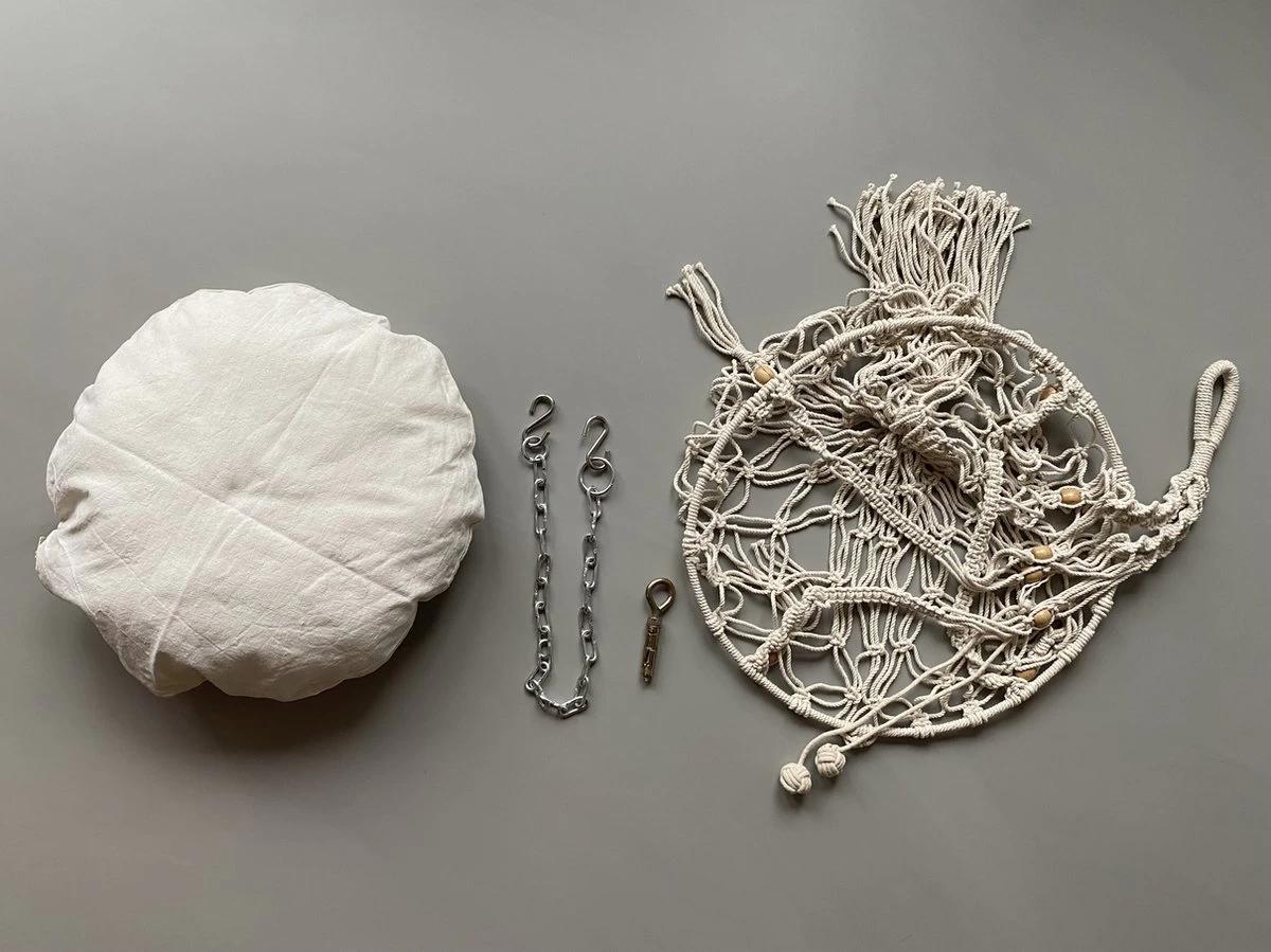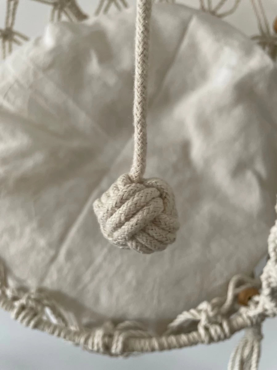 Deze kattenhangmat in natuurlijk ecru wit is perfect voor uw kat. Verder past deze hangmat in elke huiskamer. De hangmat is uitgerust met macrame koord, bevestigingsmateriaal voor stevige montage aan het plafond, lekker zachte kussen van 100% katoen, synthetische wattenvulling en speelse pom-pom bal.