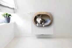 Design radiator mand gemaakt van extreem sterke duurzaam papiertouw. Bijgeleverd wordt een beige kussen. De hoes is afneembaar en te wassen in de wasmachine. Aanbevolen gewicht is 5 KG, na onze test kunnen wij verzekeren dat deze design radiator mand tot wel 7,5 Kg draaggewicht heeft. De radiator hangmand is toepasbaar op elk type verwarming tot een maximum van 15 cm diepte.