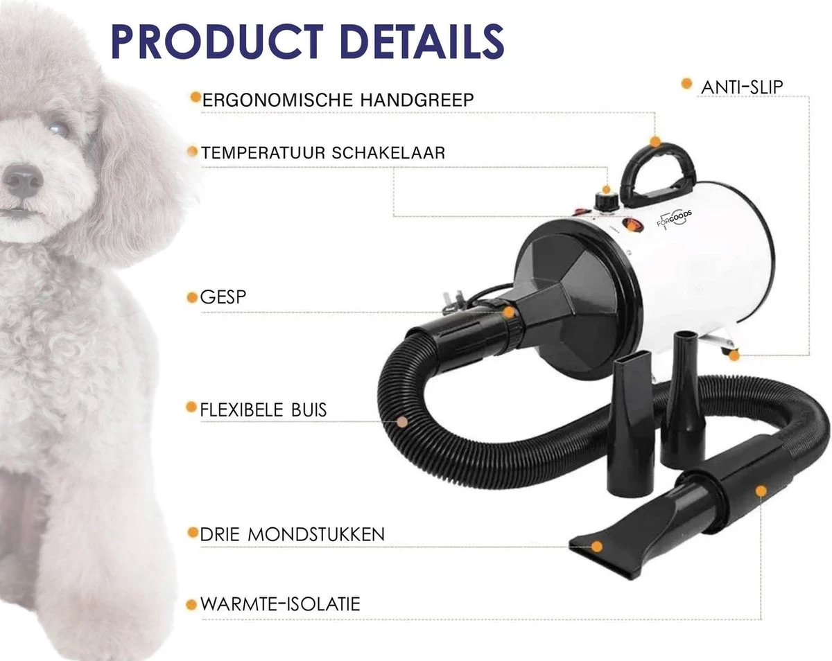 Bovendien is deze droger met 3 opzetstukken geschikt voor het drogen van verschillende vachtsoorten.