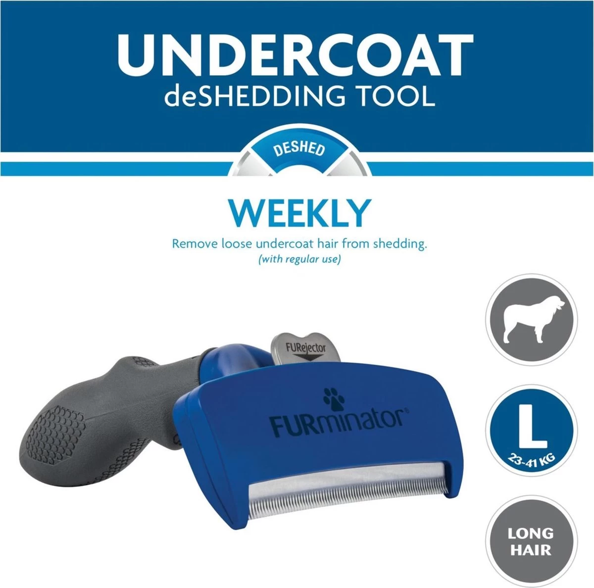 De FURminator Undercoat deShedding Tool voor grote langharige honden kamt door de toplaag en verwijdert tot 99% van het losse haar uit de ondervacht zonder de toplaag of de huid te beschadigen. Gebruik 1-2 keer per week en 10 tot 20 minuten per keer op droog haar als onderdeel van het 4-staps FURminator Ultimate Hair Reduction System. De tool is geschikt voor grote hondenrassen van 23 kg tot 41 kg.