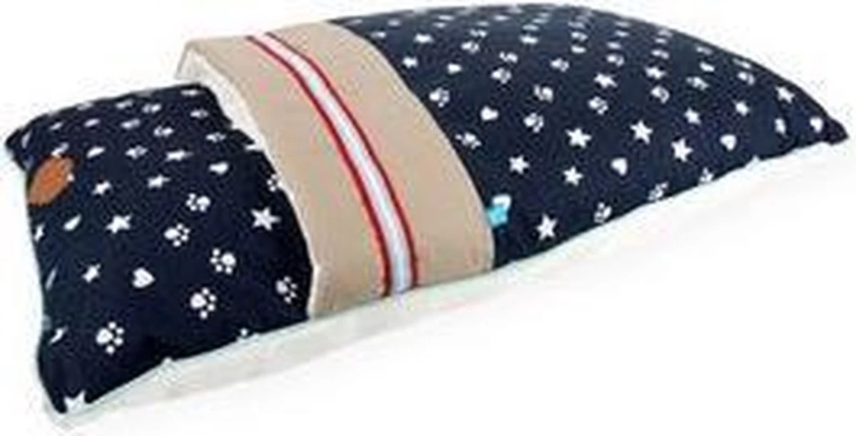 Lief! Hondenkussen met SlaapzakOp dit kussen kan jouw kleine hond heerlijk slapen. En in de slaapzak heerlijk wegkruipen op koude dagen. Het kussen is aan 2 zijdes te gebruiken.