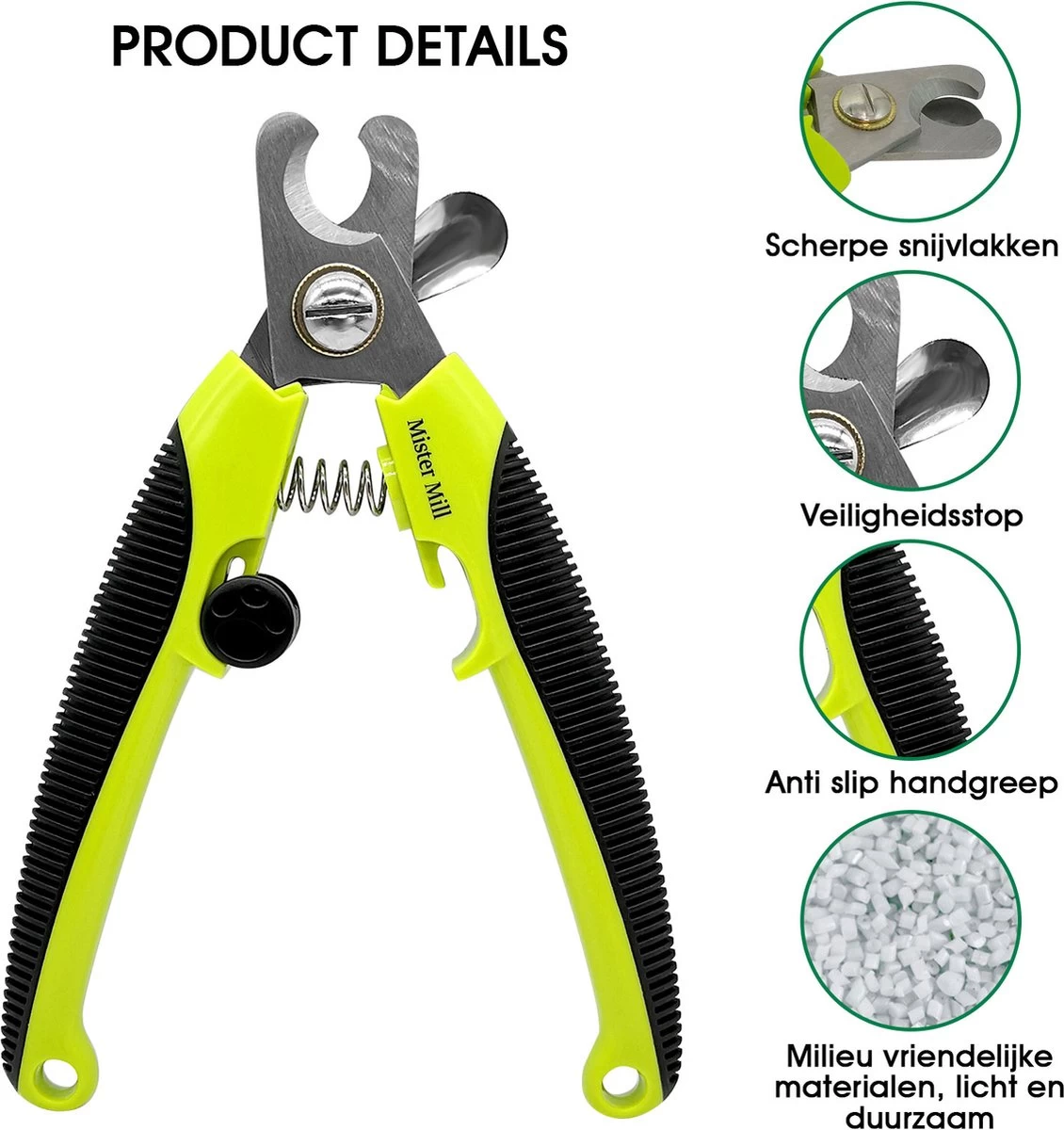 Veilig de nagels van je hond of kat (ook voor knaagdieren en grotere vogels). Je wilt toch ook dat je huisdier verzorgde en gezonde nagels heeft. Deze knip je op een eenvoudige en veilige manier met de Mister Mill nagelknipper, moeiteloos en veilig door de veiligheidsstop de nagels van je trouwe vriend(in) verzorgen!