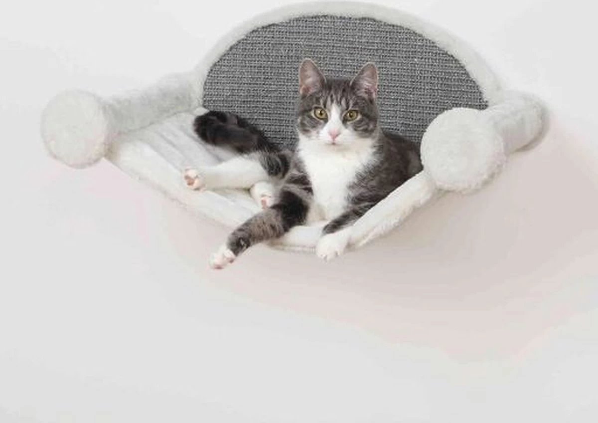 Dankzij de combinatie van een crèmekleurige sprei en het grijze kraboppervlak, past deze kattenhangmat perfect bij je bestaande kattenmeubilair.