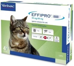 Effipro DUO spot-on Kat is een anti-vlooien en -tekenproduct voor de kat met als werkzame stoffen fipronil en pyriproxyfen. Deze combinatie van stoffen werkt 5 weken tegen vlooien op je kat en 12 weken tegen het uitkomen van eitjes in de omgeving. Effipro is ook verkrijgbaar als spray.